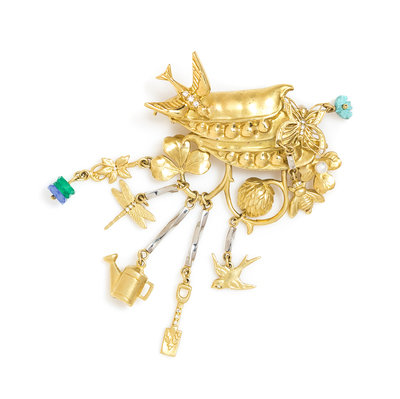 An 18 Karat Bicolor Gold, Diamond, Cultured Pearl, Glass and Hardstone Garden Motif Brooch,