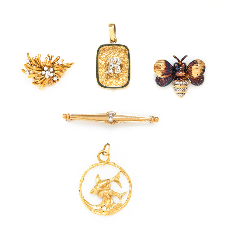 consisting of a 14 karat gold pendant with a "R" initial containing ten round single cut diamonds, a 14 karat gold bar brooch containing two round brilliant cut diamonds, one 18 karat gold double fish motif pendant containing one round brilliant cut diamond, an 18 karat yellow gold flower motif pearl shortener containing ten round brilliant cut diamonds by Kurt Wayne, together with a 14 karat gold bee motif brooch containing 17 round single cut diamonds.