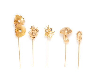 consisting of an 18 karat gold bee stickpin containing six round brilliant cut diamonds and one round sapphire, a double lily pad motif stickpin containing two brilliant cut diamonds, a harp motif stickpin containing three brilliant cut diamonds, a scarab motif stickpin, together with a mushroom motif stickpin.