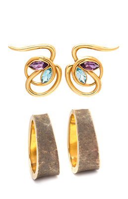 consisting of a pair of earrings with two marquise cut blue topaz and two marquise cut amethyst, together with a pair of 14 karat textured hoop earrings.