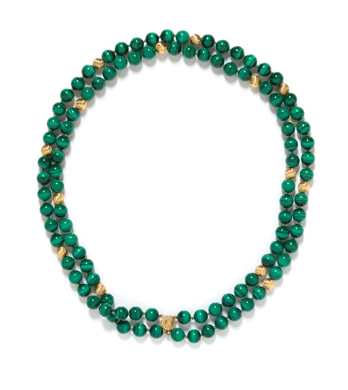 A Yellow Gold and Malachite Bead Double Strand Necklace,