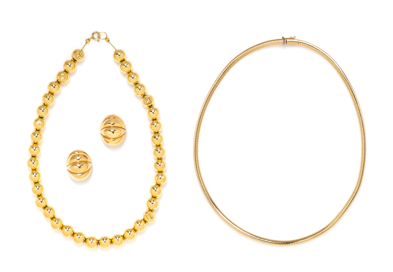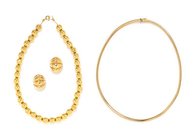 consisting of a gold bead necklace, a pair of fluted earclips together with an omega necklace measuring 3.78 mm wide.