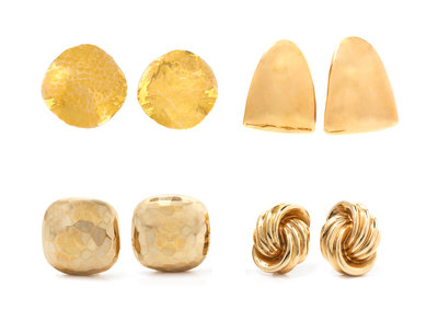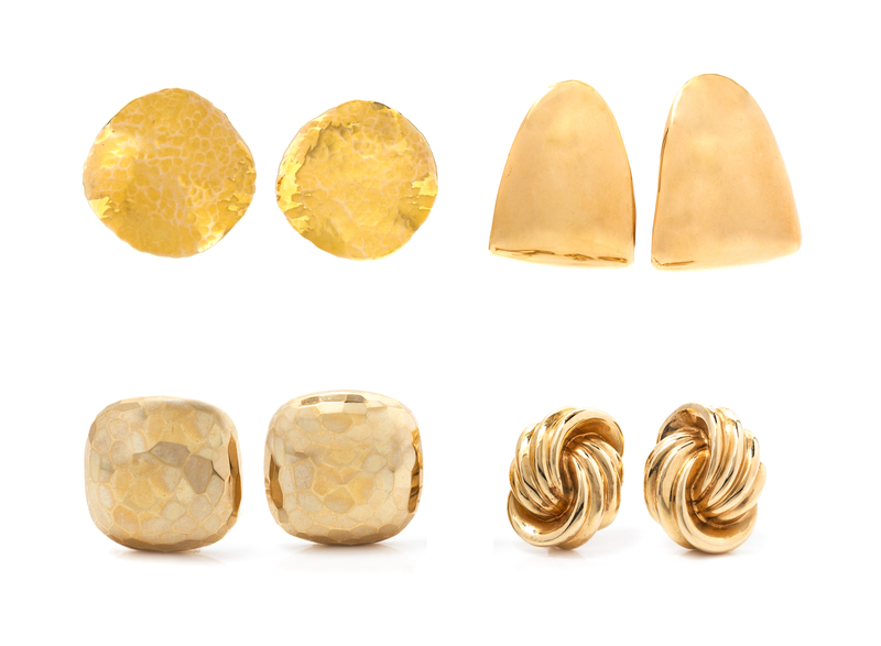 consisting of a pair of earclips in a square shaped hammered finish, a pair in a circular hammered finish, a pair in a rounded triangle shape, and a pair in a knot motif.