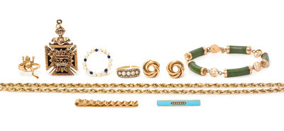 consisting of a 14 karat yellow gold rope chain necklace, a pair of yellow gold circular swirl earrings, a 14 karat yellow gold bar brooch containing light blue enamel and seven seed pearls, a 14 karat yellow gold and nephrite link bracelet, a 14 karat gold cultured pearl and sapphire circle broach, a yellow gold ring containing five pearls (origin not tested) and numerous round single cut diamonds, a yellow gold and sapphire frog motif ring, together with a rose gold, enamel, diamond and garnet Knights Templar/Masonic pendant.