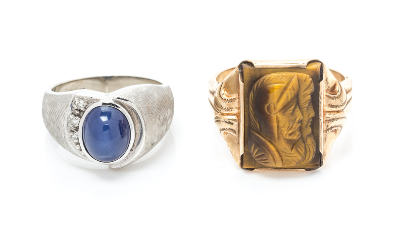 consisting of one white gold ring containing one oval cabochon cut star sapphire measuring approximately 9.65 x 7.76 x 4.72 mm and three round single cut diamonds weighing approximately 0.05 carat total together with one yellow gold ring set with a rectangular tiger's eye intaglio plaque of a male profile.Stamps: O.B. 10K and 10K obscured makers mark.