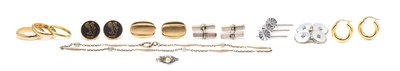 comprising of a pair of 10 karat white gold cufflinks, a matching set round post pins with a lion motif, one silver necklace clasp with a pearl, three 14 karat white gold shirt studs, a pair of 18 karat hoop earrings, one 18 karat hoop, two yellow gold rings stamped Tiffany, one yellow gold band engraved on the inside, a pair of German rolled gold textured cufflinks, a set of sterling silver cufflinks, two yellow gold paperclips, one Tiffany & Co. safety pin and one unsigned safety pin, a 14 karat white gold and faux pearl chain, four 14 karat yellow gold charms, two yellow gold flower clasps, a pair of 14 karat ball cufflinks, a 14 karat yellow gold tie clip, three yellow gold abolone shirt studs, and two 14 karat yellow gold charms.Cufflinks stamp: 10K DIANA.Earrings stamp: 18K and obscured markings.