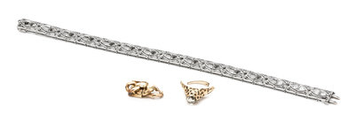 consisting of an Art Deco platinum filigree bracelet containing five old European cut diamonds weighing approximately 0.50 carat total, a 14 karat yellow gold box clasp, together with a yellow gold ring containing one oval rose cut diamond measuring approximately 6.20 x 5.20 mm.Stamp: PATFEC, 20-1916.