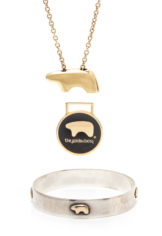 consisting of a 14 karat yellow gold bear pendant suspended on a continuous gold chain together with a sterling silver bangle bracelet surmounted with four 14 karat yellow gold bear motifs.Necklace stamp: 14K (Golden Bear logo).Bracelet stamp: STERLING 14K (Golden Bear logo).