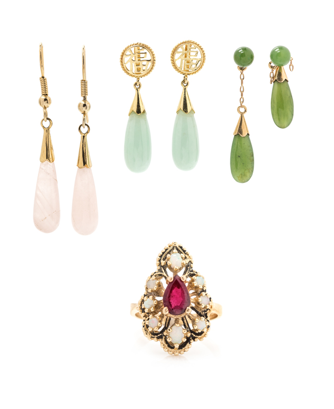 consisting of a 14 karat gold ring containing one pear shape mixed cut garnet and eight cabochon cut opals, a pair of goldtone earrings containing two rose quartz briolette drops, a pair of 14 karat yellow gold earrings containing two jade briolette drops, together with a pair of yellow gold earrings containing two nephrite jade briolette jade drops and two nephrite jade spheres.