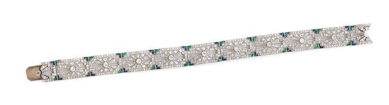 composed of openwork geometric links, the bracelet containing 10 old European cut diamonds weighing approximately 0.60 carat total, 524 round brilliant and single cut diamonds weighing approximately 2.50 carats total, and numerous square step cut emeralds and sapphires.