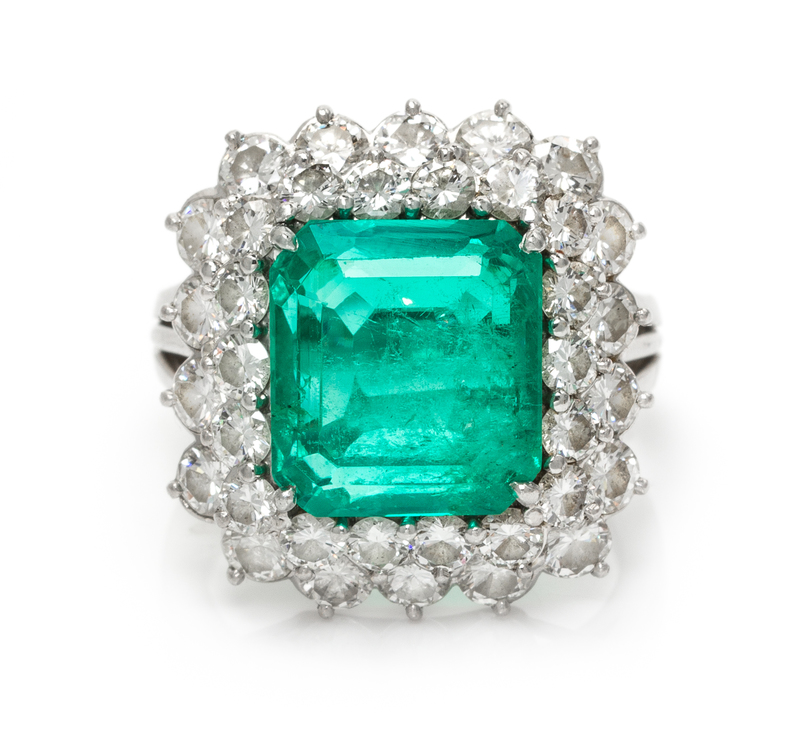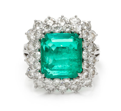 containing one octagonal step cut emerald measuring approximately 11.53 x 10.48 x 7.01 mm, together with 36 round brilliant cut diamonds weighing approximately 2.85 carats total.Stamp: 1746.