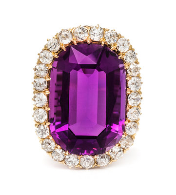 containing one oval mixed cut amethyst weighing approximately 15.26 carats and 25 old mine cut diamonds weighing approximately 1.50 carats total.