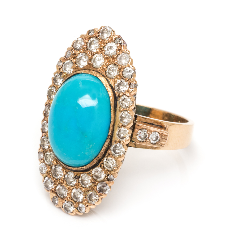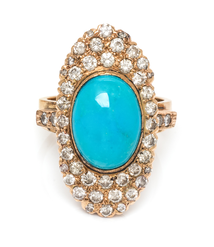 containing one oval cabochon cut turquoise measuring approximately 13.30 x 9.75 x 6.11 mm and 46 round brilliant cut diamonds weighing approximately 1.28 carats total.