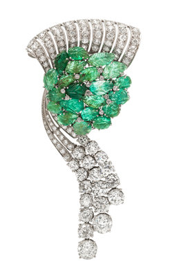 consisting of a central cluster setting containing 21 carved leaf motif emeralds weighing approximately 10.75 carats total, the cluster accented above with a ribbon motif section with scrollwork gallery and an articulated three row drop suspended below, the brooch containing two old European cut diamonds weighing approximately 2.84 carats total, 17 old European cut diamonds weighing approximately 7.00 carats total, and 86 old European, round transitional and single cut diamonds weighing approximately 2.96 carats total.