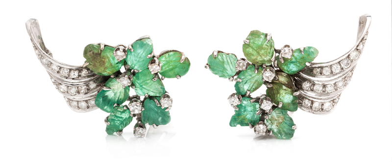 in a spray style, the earclips containing 46 round brilliant and single cut diamonds weighing approximately 1.04 carats total, together with 14 carved leaf motif emeralds, white gold clip backs.