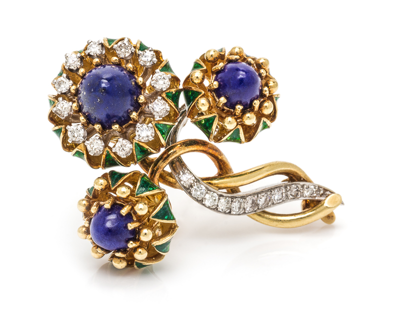 in a stylized foliate motif, the three flowers each containing a bullet shape cabochon cut lapis lazuli within a ring of green enamel petals, the center flower and stem containing numerous diamonds weighing approximately 0.75 carat total.Stamp: 18Kt La Triomphe (maker's mark).