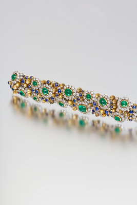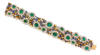 consisting of a repeated alternating pattern composed of 15 oval cabochon cut emeralds within platinum surrounds accented with 195 round brilliant cut diamonds weighing approximately 18.48 carats total interspersed with fluted and domed yellow gold sections and 66 bezel set round and oval cabochon cut sapphires.