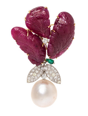 containing one drop pearl (origin not tested) measuring 17.79 x 16.55 x 14.29 mm, three carved rubies in a leaf motif measuring approximately 29.00 x 17.04 mm, 28.00 x 14.00 mm, and 18.90 x 14.80 mm respectively, one pear shape emerald measuring approximately 5.50 x 3.00 mm, two round brilliant cut diamonds weighing approximately 0.26 carat total, and 34 round single cut diamonds weighing approximately 1.19 carats total.