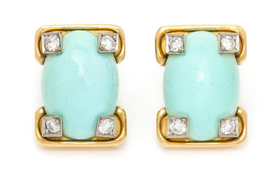 A Pair of 18 Karat Yellow Gold, Platinum, Turquoise and Diamond Earclips,