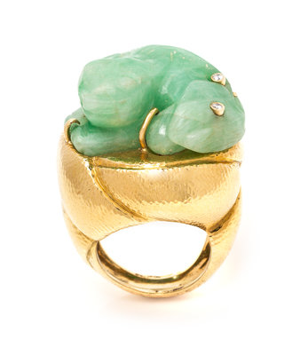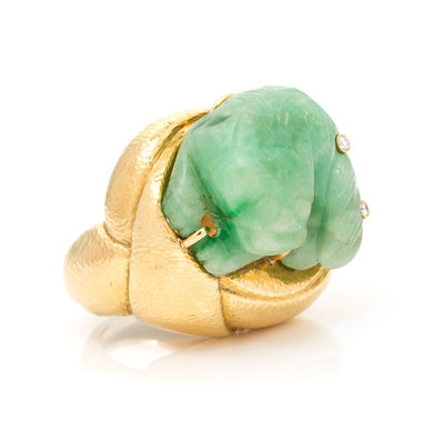 An 18 Karat Yellow Gold, Carved Jadeite Jade and Diamond Ring, David Webb,