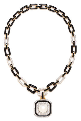 consisting of open geometric gold links in a graduated design and accented with black enamel, together with a removable pendant containing one pearl measuring approximately 14.08 mm in diameter, the pendant and necklace containing 181 round brilliant cut diamonds weighing approximately 4.35 carats total.Stamp: 18K PLAT WEBB.
