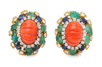 A Pair of 18 Karat Yellow Gold, Platinum, Coral, Diamond, Sapphire and Emerald Earclips, David Webb,