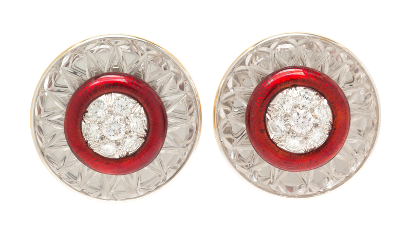 consisting of two round carved rock crystal plaques measuring approximately 26.00 mm in diameter, the centers surmounted with a central cluster of 14 round brilliant cut diamonds weighing approximately 1.80 carats total within translucent red enamel surrounds over textured ground.Stamp: WEBB PLAT 18K.Accompanied by a case signed DAVID WEBB.