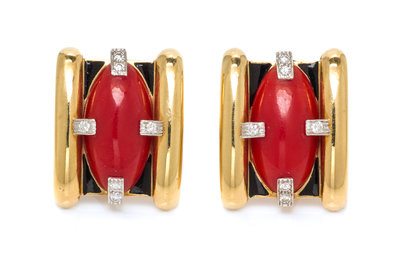 A Pair of 18 Karat Yellow Gold, Platinum, Coral, Diamond and Enamel Earclips, David Webb,