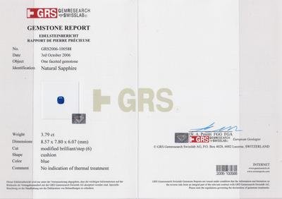 measuring approximately 8.57 x 7.80 x 6.07 mm.Accompanied by a Gem Research Swisslab (GRS) gemstone certificate number GRS2006-100588, dated October 3, 2006, stating: Natural Sapphire, Weight: 3.79 Carats, Color: Blue, Comments: No indication of thermal treatment.