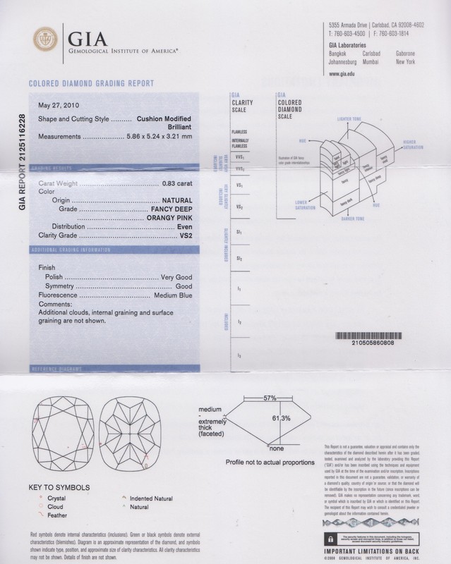 measuring approximately 5.86 x 5.24 x 3.21 mm.Accompanied by a Gemological Institute of America colored diamond grading certificate number 2125116228, dated May 27, 2010, stating Color: Fancy Deep Orangy Pink, Even, Clarity: VS2, Polish: Very Good, Symmetry: Good, Fluorescence: Medium Blue.