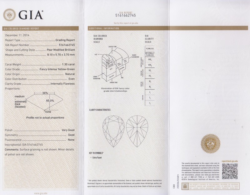 measuring approximately 8.10 x 5.70 x 3.70 mm.Accompanied by a Gemological Institute of America colored diamond grading certificate number 5161662745, dated December 11, 2014, stating Color: Natural Fancy Intense Yellow-Green, Even, Clarity: IF, Polish: Very Good, Symmetry: Good, Fluorescence: None.