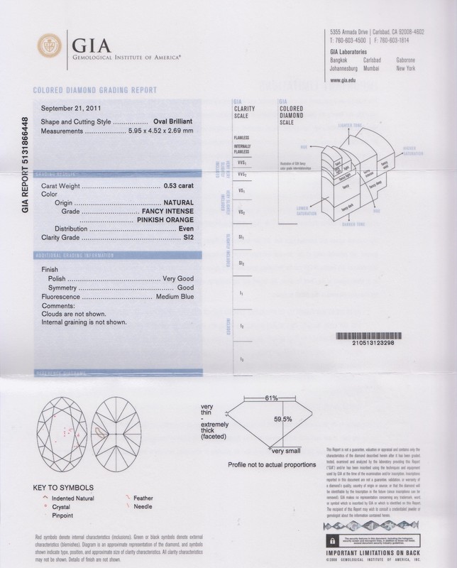 measuring approximately 5.95 x 4.52 x 2.69 mm.Accompanied by a Gemological Institute of America colored diamond grading certificate number 5131866448, dated September 21, 2011, stating Color: Fancy Intense Pinkish Orange, Even, Clarity: I2, Polish: Very Good, Symmetry: Good, Fluorescence: Medium Blue.