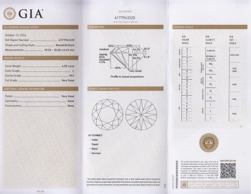 measuring approximately 10.40 x 10.24 x 6.43 mm, together with an 18 karat yellow gold ring setting.Accompanied by a Gemological Institute of America diamond grading certificate number 6177943320, dated October 12, 2016, stating Weight: 4.25 carats, Color: L, Clarity: VS1, Cut: Very Good, Polish: Very Good, Symmetry: Good, Fluorescence: None.