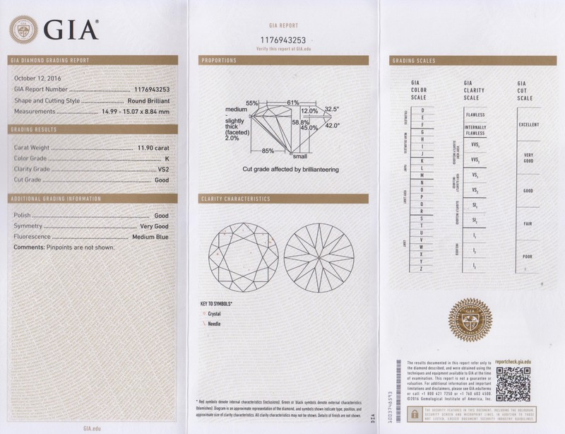 measuring approximately 15.07 x 14.99 x 8.84 mm, together with a platinum solitaire ring setting.Accompanied by a Gemological Institute of America diamond grading certificate number 1176943253, dated October 12, 2016, stating Weight: 11.90 carats, Color: K, Clarity: VS2, Cut Grade: Good, Polish: Good, Symmetry: Very Good, Fluorescence: Medium Blue.
