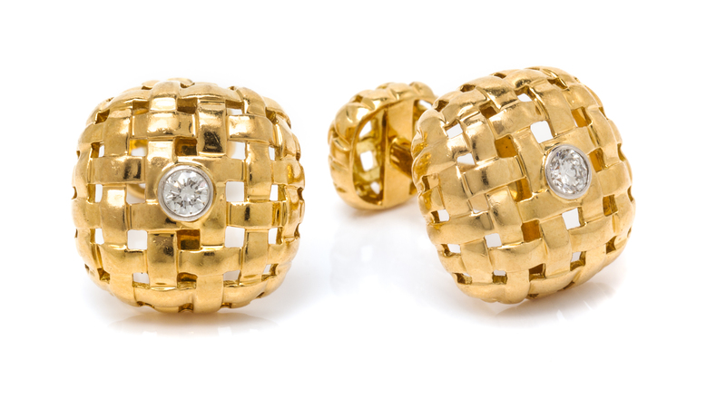 in a gold cushion shape openwork basketweave design, containing two platinum bezel set round brilliant cut diamonds weighing approximately 0.26 carat total, fixed backs in an identical design.Stamp: T&CO. 750 1995.