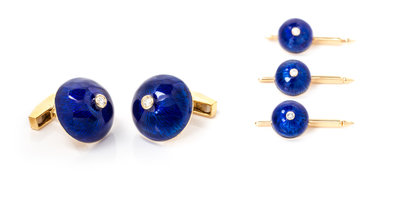 composed of a pair of cufflinks and three matching dress studs accented with translucent blue enamel over textured ground, containing five round brilliant cut diamonds weighing approximately 0.24 carat total.Stamp: 18K KI.