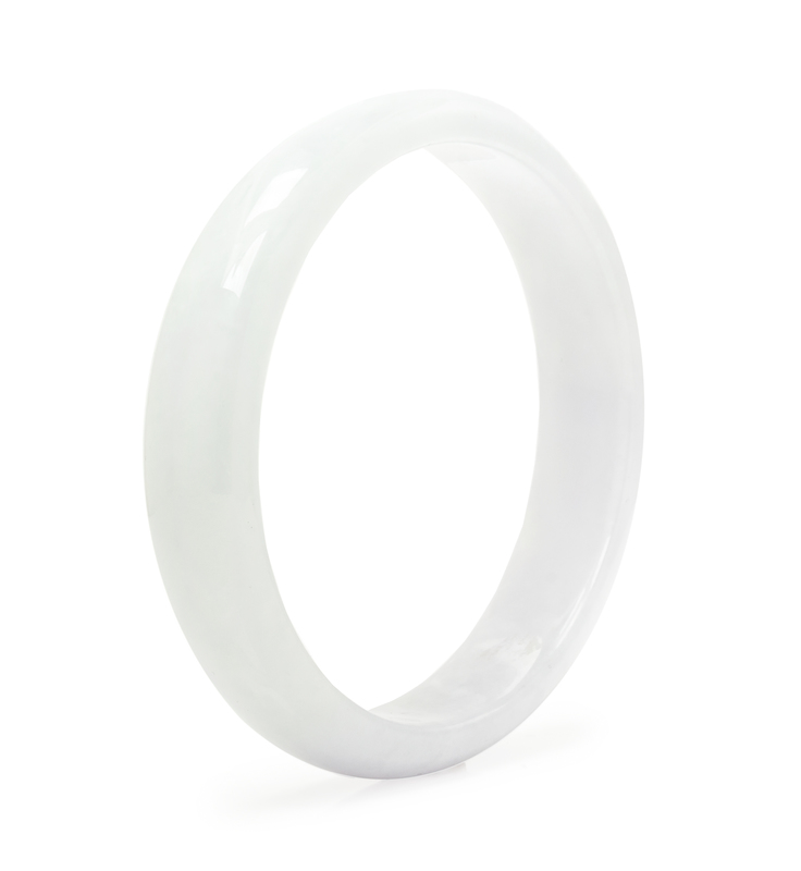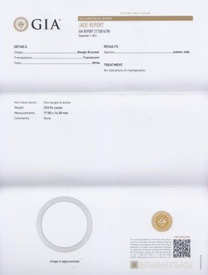 measuring approximately 77.05 mm in diameter and 14.30 mm wide.Accompanied by a Gemological Institute of America jade identification certificate number 2175814298, dated September 7, 2016, stating Species: Jadeite Jade, Color: White, Transparency: Translucent, Treatment: No indications of impregnation.