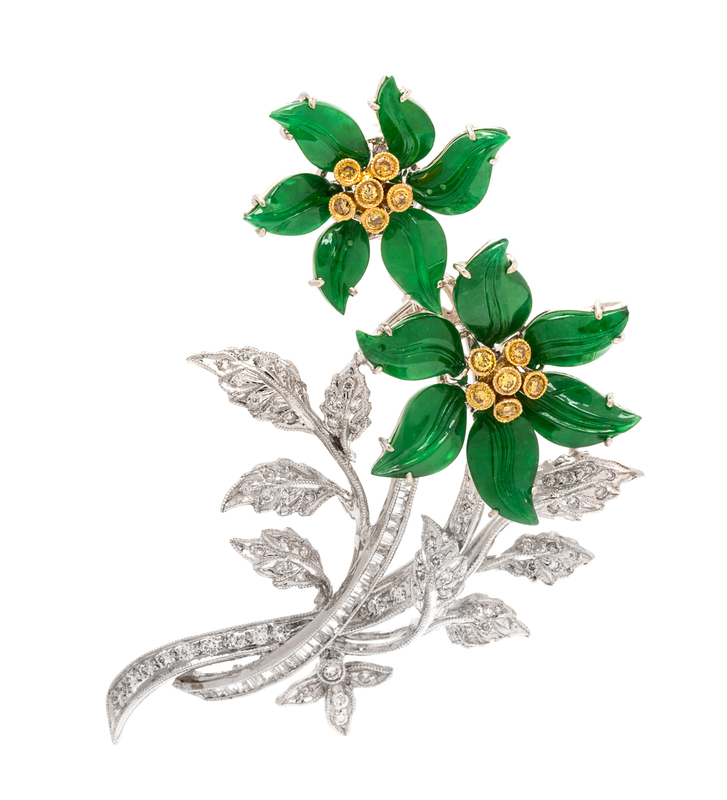An 18 Karat Bicolor Gold, Jadeite, Diamond, and Colored Diamond Brooch,