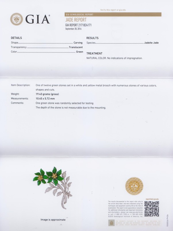 containing 12 carved translucent green jade petals measuring approximately 10.45 x 5.72 mm, numerous baguette cut diamonds weighing approximately 0.30 carat total, numerous round brilliant cut diamonds weighing approximately 0.34 carat total, and 12 round brilliant cut yellow diamonds (origin of color not tested) weighing approximately 0.20 carat total.Stamp: 18K.Accompanied by a Gemological Institute of America jade identification certificate number 2171824171, dated September 20, 2016, stating Species: Jadeite Jade, Color: Green, Transparency: Translucent, Treatment: Natural Color, no indications of impregnation.