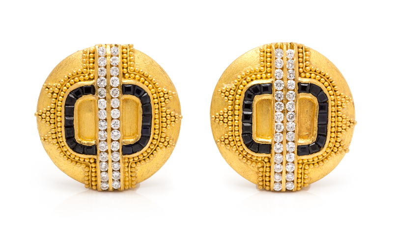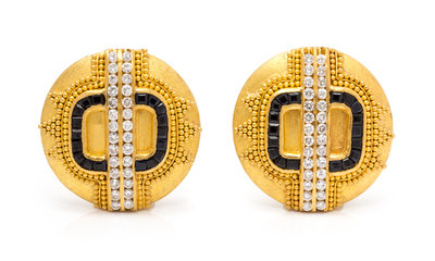 in a circular design with brushed finish ground accented with granulation in a geometric pattern, the earclips containing 56 round brilliant cut diamonds weighing approximately 0.85 carat total and 36 square step cut sapphires weighing approximately 0.70 carat total within channel settings.Stamp: HILAT.