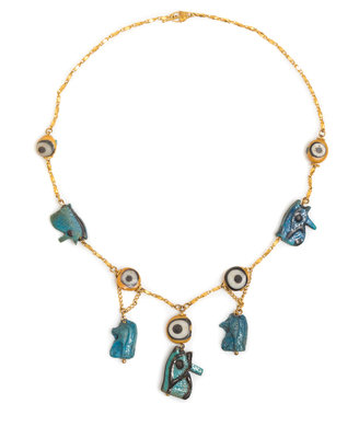 consisting of a faceted bead link chain containing five yellow, white and black "evil eye" and two faience "eye of Horus" beads and suspended a fringe of three faience "eye of Horus" beads.