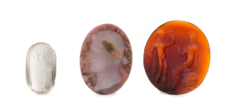 consisting of an intaglio depicting two Classical figures, a cameo depicting a Classical Greek figure wearing a laurel wreath together with a reverse carved intaglio depicting an angel holding a globus cruciger (possibly 6th century), together with a lucite stand.