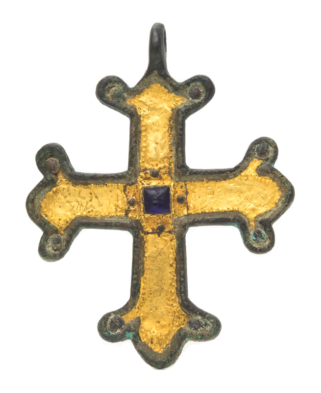 A Bronze Cross with Gold Inlay and Blue Glass Accent,