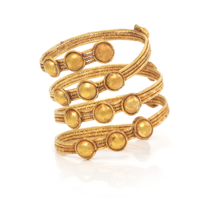 exhibiting a flexible spiral design with 16 half dome accents and woven construction.