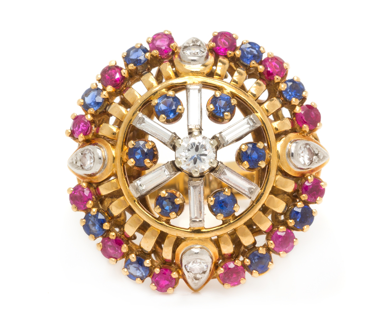 An 18 Karat Yellow Gold, Diamond, Sapphire and Ruby Ring,