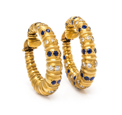 A Pair of 18 Karat Yellow Gold, Sapphire and Diamond Hoop Earclips,