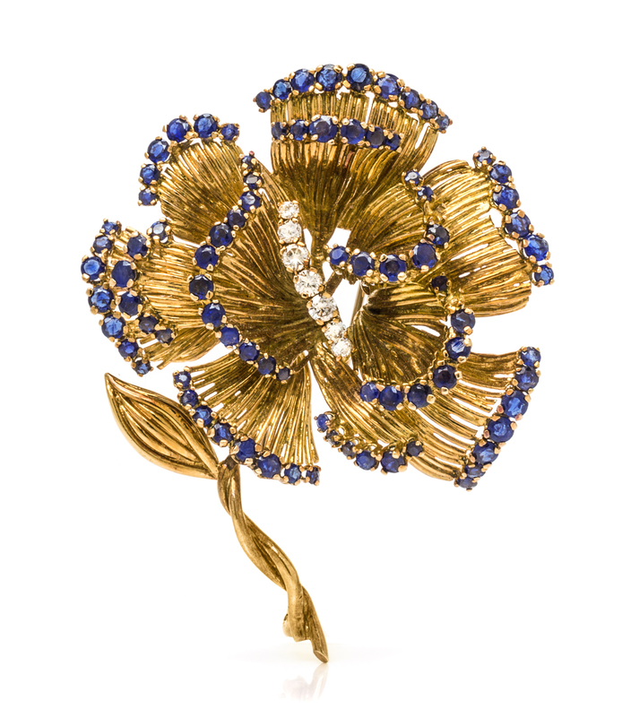 An 18 Karat Yellow Gold, Sapphire and Diamond Flower Motif Brooch,