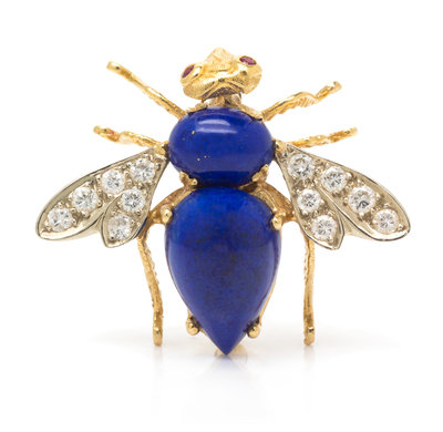 containing one pear shape and one oval cabochon cut sodalite comprising the thorax and abdomen, the head containing two round mixed cut ruby eyes, the wings containing 12 round brilliant cut diamonds weighing approximately 0.48 carat total, the legs of textured wirework.Stamp: 18K.