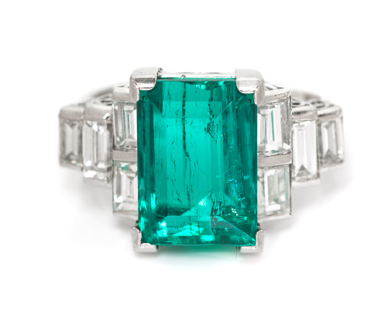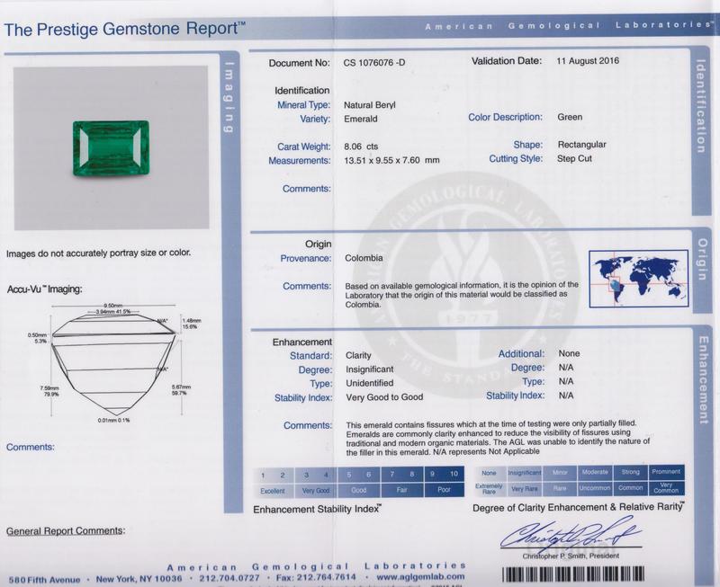 containing one rectangular step cut emerald weighing approximately 8.06 carats and eight baguette cut diamonds weighing approximately 1.84 carats total. Stamp: PT950. Accompanied by an American Gemological Laboratories emerald identification and origin certificate number CS 1076076, dated August 11, 2016, stating Mineral Type: Natural Beryl, Variety: Emerald, Origin: Colombia, Clarity Enhancement: Insignificant.