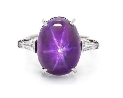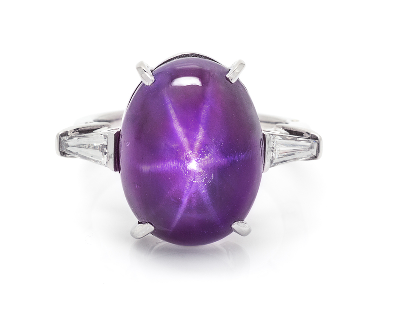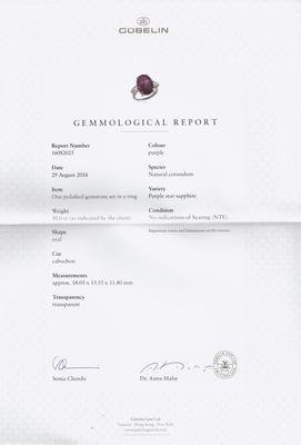 containing one oval cabochon cut star purple sapphire measuring approximately 18.02 x 13.54 mm and two tapered baguette cut diamonds weighing approximately 0.81 carat total.Accompanied by a Gubelin Gemological Laboratories sapphire identification and origin certificate number 16082025, dated August 29, 2016, stating Species: Natural Corundum, Variety: Purple Star Sapphire, Condition: No indication of heating.